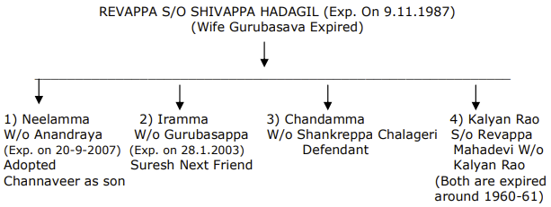 The present regular second appeal by the legal representatives of the defendant assailing the judgment and decree of the appellate Court in reversing the judgment and decree of the trial Court, holding that the plaintiff, is the adopted son of deceased Neelamma w/o Anandraya Hadagil, the absolute owner in exclusive possession of the suit schedule property and the partition in favour of defendant is declared as null and void, not binding on the plaintiff.