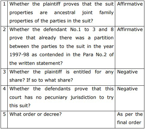 3. Brief facts are as below: The genealogical tree of the family of the plaintiff and defendants is not in dispute. The propositus of the family Hanmantappa had four sons and two daughters, namely; Bheemanna (who is now represented by defendant Nos. 4 to 7), Manikappa- the plaintiff, Shekhardefendant No.1, Sharanappa-defendant No.2 and Mallappa-defendant No.3 and two daughters, namely Droupadi and Narasamma.
