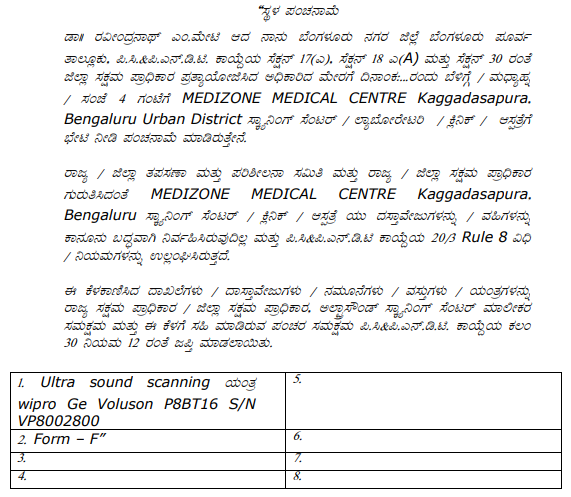 Both the petitioners are doctors. The 1st petitioner is the proprietor of the Diagnostic Centre in the name and style of ‘Medizone Medical Centre’ (the Centre’ for short). The 2nd petitioner is a certified registered operator of the ultrasound machine at the Diagnostic Centre. It is the averment in the petition that the ultrasound diagnostic procedures are conducted at the centre between 10.30 a.m. and 11.30 a.m. and between 6.00 p.m. and 7.00 p.m. on the prescription of doctors who direct a test to be conducted upon the patients. When things stood thus, the 1st respondent/Appropriate Authority under the Act, on receipt of certain information, conduct an inspection at 4.0