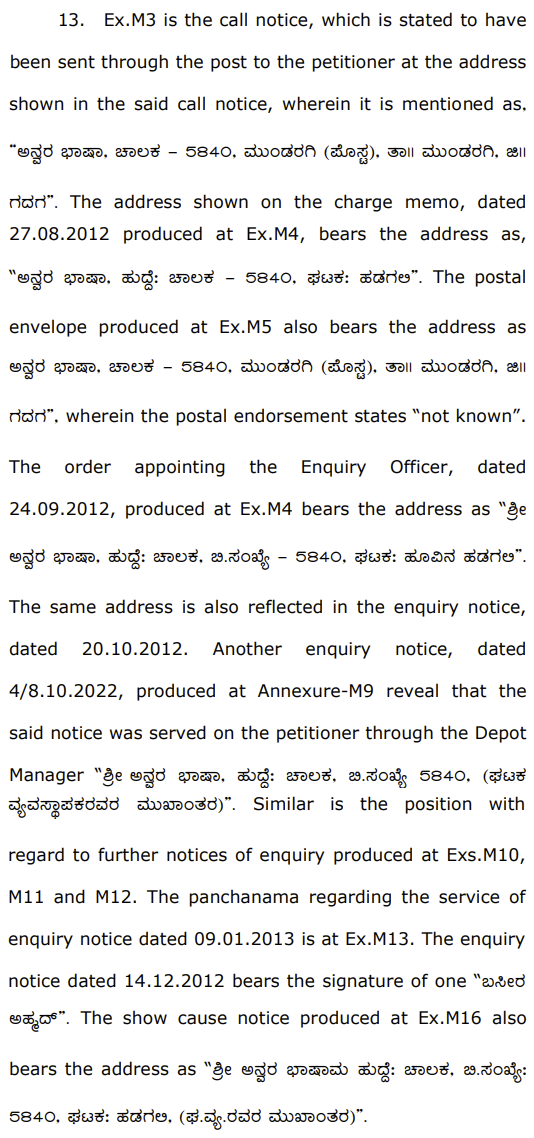 2. The case of the petitioner is that, he was appointed as a Driver in the respondent – Corporation. That, a charge memo was issued to him alleging that, he was absent for a period of 44 days without sanction of leave between 13.07.2012 to 09.08.2012. An enquiry was conducted by the respondent – Corporation, wherein the petitioner was held to be on unauthorised abse