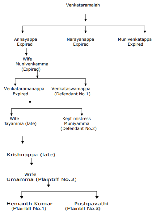 3. That plaintiff Nos.1 to 3 arrayed as respondent Nos.1 to 3 in this appeal filed a suit in O.S.No.463/2006 against defendants seeking relief of partition and separate possession of the suit schedule properties more fully described in the schedule appended to the plaint with mesne profits thereon. (Hereinafter referred to as 'suit schedule properties' for the purpose of convenience). The plaintiffs have furnished the genealogical tree to show their relationship with defendant nos.1 to 3. The following genealogical will be helpful in appreciating the claims
