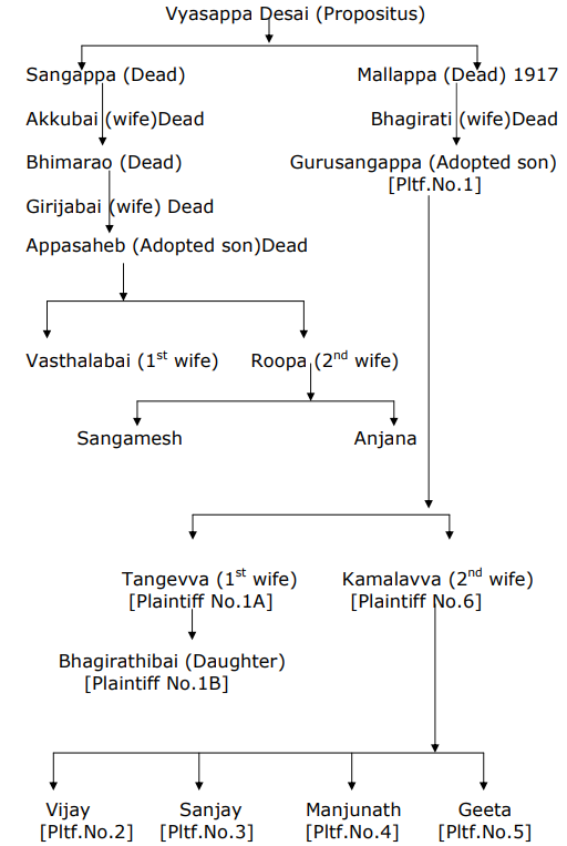 2. One Vyasappa Desai was the propositus. He had two sons Sangappa and Mallappa. Both Sangappa and Mallappa are dead. Mallappa died in the year 1917, this is a relevant year. Mallappa was survived by his wife Bhagirathi. In the year 1937 Bhagirathi took Gurusangappa in adoption. Said Gurusangappa is the plaintiff No.1. Gurusangappa had two wives Tangevva/plaintiff No.1A and Kamalavva/Plaintiff No.6. The children of second wife Kamalavva are plaintiffs No.2, 3, 4 and 5. Plaintiff No.1A is first wife and plaintiff No.1B is daughter. After the demise of Gurusangappa during the pendency of the suit, his first wife Tangevva/plaintiff No.1A and daughter Bhagirathi/plaintiff No.1B came on record. The suit is filed against Appasaheb who is the adopted son of Bhimrao and Bhimrao is the son of Sangappa. The suit for partition is filed on the premise that the property inherited by Mallappa from his father Vya