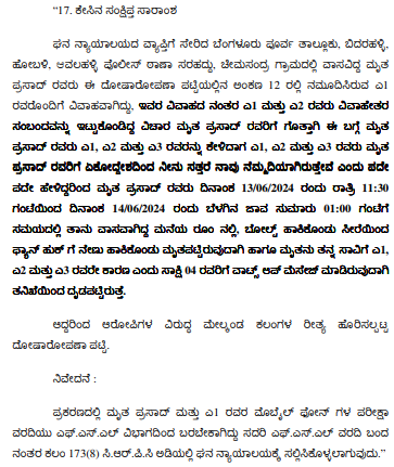 The son of the second respondent gets married to accused No.1 on 18.02.2024. The son and the daughter in-law shift to a separate residence. The relationship between the two soon began to sore after marriage and the husband generated apprehension of the newly married wife to be having an affair with the petitioner – accused No.2. The allegation in the complaint is that, on the discovery of the affair of the wife with the petitioner, she began to torture the son of the complainant, whom she was married three months ago. Alleging that the son – victim was tormented and tort
