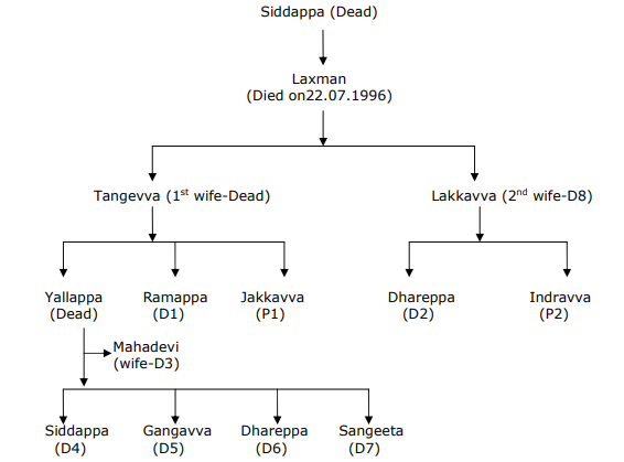 b) As can be seen from the aforesaid genealogical tree, the aforesaid Laxman, who died on 22.07.1996 was married to one Tangevva, who was his first wife through whom he had three sons viz., i) late Yallappa, ii) Ramappa and iii) Jakkavva. The deceased Yallappa left behind his wife Mahadevi and four children. The aforesaid Jakkavva is the plaintiff No.1 while her brother-Ramappa is defendant No.1 and Yallappa’s heirs are defendants No.3 to 7 in the suit.