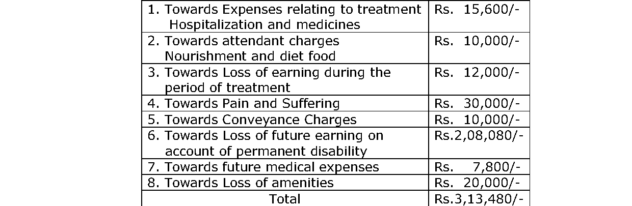 3. The factual matrix of the case is that on 27.07.2010 at about 06.00 p.m., while the petitioner was driving his TVS Moped bearing No. KA.02.ET.3975 along with a pillion rider near Venkateshwara Garage at about 07.30 p.m., a tempo bearing No.TN.54.Y.7645 driven by respondent No. 1, owned by respondent No. 2 and insured by respondent No. 3 came in a rash and negligent manner and collided with the two wheeler of the petitioner resulting in the petitioner sustaining injuries to his right leg, right hand etc. The petitioner and the pillion rider were admitted to the hospital and it was found that the petitioner had sustained fracture of the right radius coupled with a nerve palsy on the right hand. The petitioner contended that he was a driver by profession and was earning Rs.10,000/- per month and