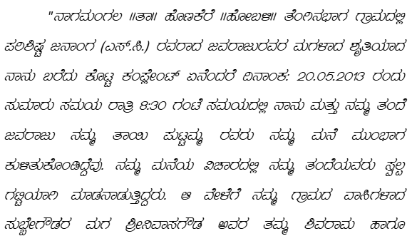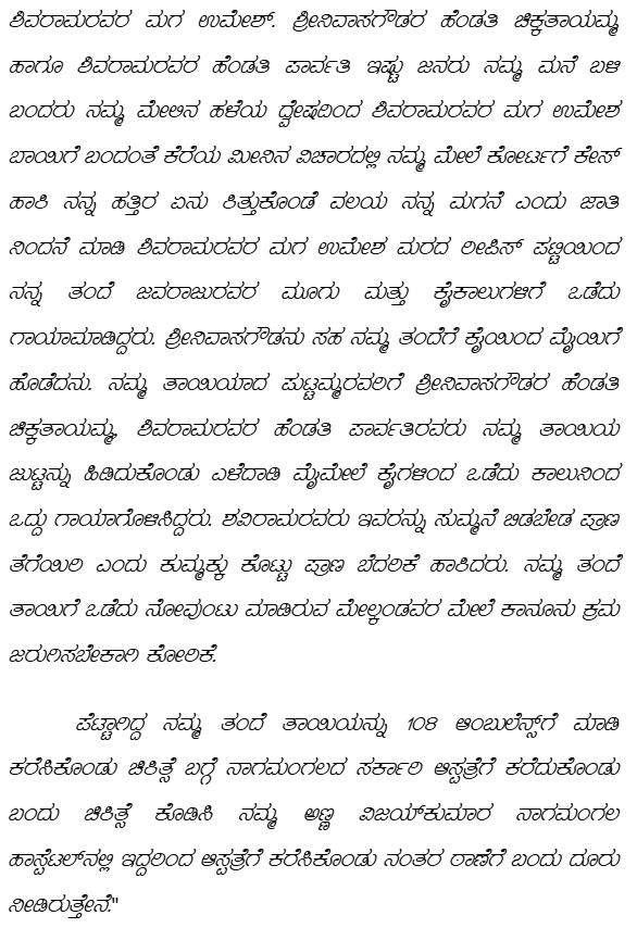 4. It is alleged by the prosecution that on 20.05.2013 at about 08.30 P.M. in Thenginabhaga Village in Nagamangala Taluk, when the complainant-Shruthi and her parents Javaraju and Puttamma, who are CW2 and CW3, were talking with each other in front of their house, at that time accused 1 to 3 with respect to ill-will reading aquaculture in the tank of Tenginabhaga Village and with an intention of giving torture, had been to the house of the
