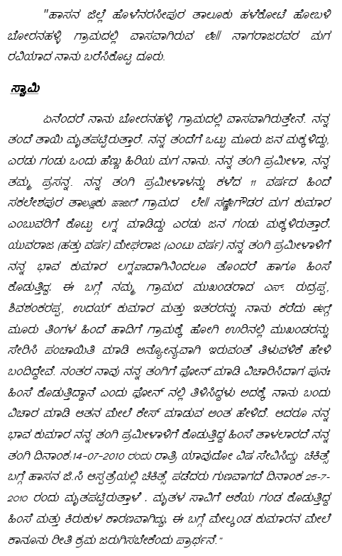 4. It is alleged by the prosecution that, the father of the complainant has three children, i.e. two sons and one daughter. The daughter-Prameela was given in marriage to accused Kumaraswamy and their marriage was solemnized about 12 years ago. In the wedlock, they have begotten two sons Yuvaraj and Megharaj, who are now aged 10 years and 8 years, respectively. Since the date of marriage, the accused was giving harassment, both physically and mentally, to the deceased. Three months prior to the incident, some elders in the village, convened panchayat and advised both husband and wife to live peacefully. In spite of it, accused did not mend his ways and conti