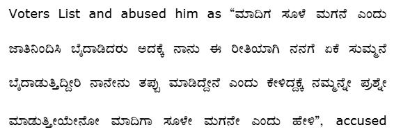 3. The brief facts leading to this appeal are that the Deputy Superintendent of Police, Challakere Sub-Division, Challakere, submitted a charge sheet against accused No.1 to 3 for the offence under Sections 324 , 504, 506 read with Section 34 of IPC and Section 3(1)(x) of the Scheduled Castes and Scheduled Tribes (Prevention of Atrocities) Act, 1989, read with of . It is alleged by the prosecution that the complainant-Mudalagiri is the resident of Chikkenahalli village, Challakere Taluk and he belongs to Adi Karnataka caste. On 01.05.2011, since there was election to Challakere Taluk APMC, and in that regard, at about 11.15 a.m., the complainant and his father-Dyamanna came to Chikkenahalli bus-stand in order to go to Kaparahalli village to cast their votes and in the said bus stand one Vishwanatha and Thipp