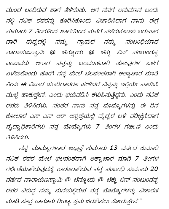 3. The brief facts leading to this appeal are that the Circle Inspector, Kolar Rural Police, Kolar, filed the charge sheet against the accused for the offences punishable under Sections 376 , 506 of IPC and Section 6 of Protection of Children from Sexual Offences Act, 2012 (hereinafter referred to as 'the POCSO Act', for short). It is the case of the prosecution that, the victim girl aged about 13 years, was studying in 8th standard in Government High School, Arabikotthanuru village. When the victim was going to School, accused used to follow her and talk with familiarly with her. CW1, CW3 and CW4 advised the accused not to follow the victim girl. Despite of it, about 7 to 8 months ago, when the victim while returning from school, alighted the bus at Chunchadenahalli gate and was walking towards home, at that time accused met her and told that h