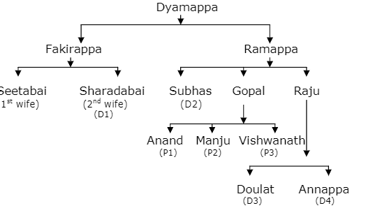a) The defendant No.1 happens to be the wife of Fakirappa, who was the first son of Dyamappa. Fakirappa had his first wife Sitabai, who is no more. Fakirappa and his first wife Sitabai and second wife-defendant No.1 were issueless. The brother of Fakirappa i.e., Ramappa predeceased him leaving behind his three sons i.e., Subhash, Gopal and Raju. Gopal died on 28.04.2006 leaving behind the plaintiff No.1 to 3. Raju, the third son of Ramappa, died leaving behind him his sons defendant No.3 to 4.