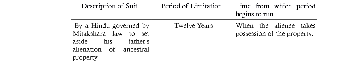 The suit regarding alienation of ancestral property is governed by Article 109 of the Limitation Act, allowing for a 12-year period, which was not adhered to, leading to its dismissal.