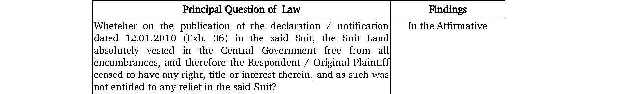 2. The principal question for determination in the present Second Appeal raised by Appellant is :- "Whether on the date of publication of declaration / notification under Section 3 -D of the National Highways Act, 1956 (for short "the said Act") the land acquired would vest in the Central Government from all encumbrances and completely extinguish the right of the owner of the said land. Once this question is answered all other consequential issues, inter alia, relating to possession, receipt of compensation will stand answered accordingly.