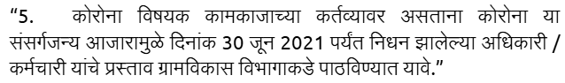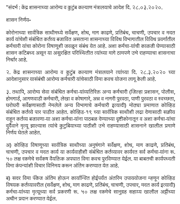 “b) On perusal of the same, this Hon'ble Court by an appropriate Writ, Order and or Direction be pleased to direct the Respondent No. 1 to 3 to grant the benefit of Ex-gratia / Insurance Cover cum Compensation under Government Resolution dated 29.05.2020 passed by the Respondent No.2 and the Government Resolution dated 25.04.2022 giving benefit of Insurance Cover/ Ex- gratia. benefit of Rs.50,00,000/- to the Petitioners herein the Legal Representatives of deceased Santosh Vishnu Shinde who died on 03.07.2021 having contracted Covid -19 while discharging oicial duties.