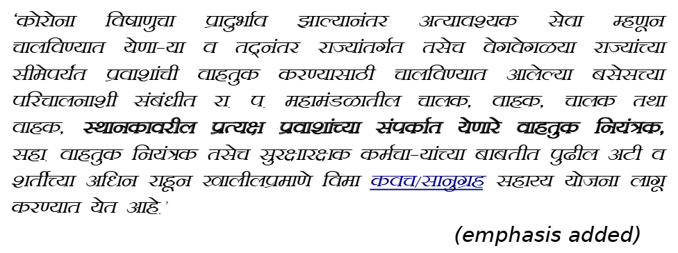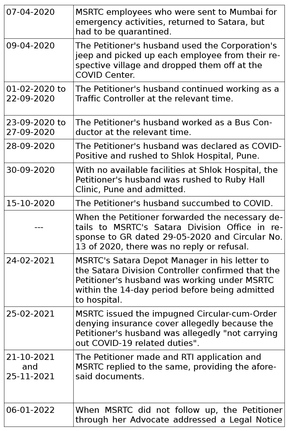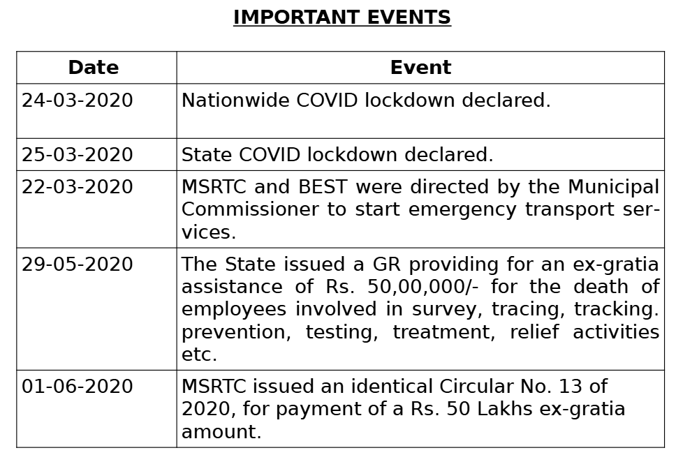 2. By this Petition filed under Article 226 of the Constitution of India, the Petitioner is challenging order dated 15/2/2021, by which, it has been held that as the deceased husband of the Petitioner i.e. Dattatraya Shinde was not doing actual duty related to COVID-19 pandemic, and therefore, the Petitioner is not entitled for the compensation which is to be given to the family members of the employees, who succumbed to COVID-19 pandemic while performing their duties.
