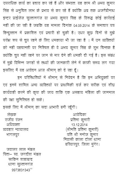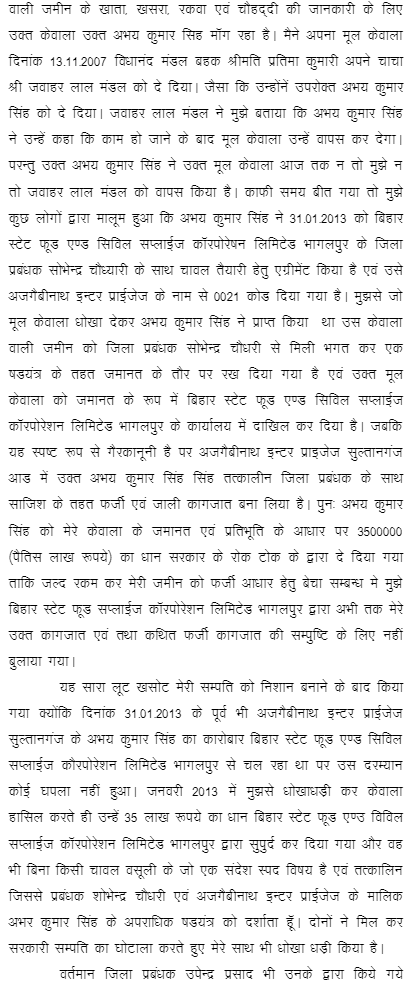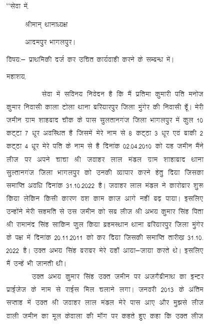 2. As per case of prosecution, a piece of land which was owned by the informant was leased to her uncle for business purposes, which was further sub-let to co-accused, namely, Abhay Kumar Singh as the business of her uncle did not go well. The said co-accused Abhay Kumar Singh established a rice mill on the land of the informant, who approached in January, 2013 to uncle of the informant and requested to provide the original land deed on the pretext of getting correct information regarding boundaries and specifications of the land. The original document of land, which was obtained by co-accused Abhay Kumar Singh as aforesaid, was not returned to the informant, and later on, she came to know that co-accused Abhay Kumar Singh in connivance with the petitioner mortgaged the land of the informant and took a supply contract of paddy to the Bihar State Food and Civil Supplies