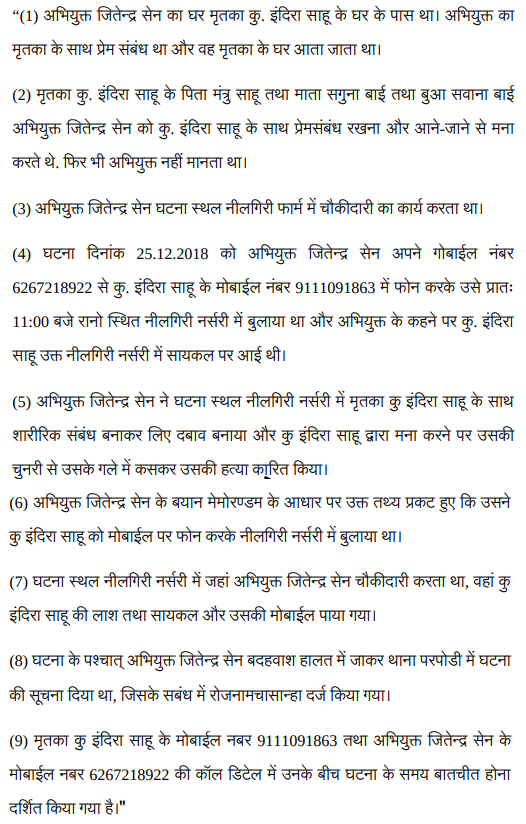 2. Facts of the case in nut shell are that on 25.12.2018, deceased-Indira Bai was in the house along with her Aunt Sabana Bai & Grandmother Baisakhin Bai. On the same day Mantruram returned to his home and enquired about the deceased- Indira Bai and then he came to know that she was not at home. During search, he came to know that his daughter- Indira Bai was lying dead at Neelgiri farm. The appellant was chasing the deceased for last one year for which Mantruram & his wife restrained them for talking to each other. On the date of the incident, the appellant called the deceased at Neelgiri farm and strangled her by her scarf. On the basis of morgu