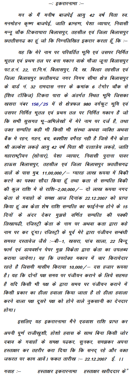 2.Brief facts of the case, as per the plaint averments, are that the defendant is owner and in possession of land admeasuring 980 sq.ft. of Khasra No.156/25 situated at Mouza Juna Bilaspur, P.H. No.22, Tahsil and District Bilaspur, Ward No.32, Ramdas Nagar, Tagore Chowk, Tikrapara, on which a house is built on ground floor and first floor (hereinafter referred to as the ‘suit land’). The defendant agreed to sell the suit land to plaintiff for total sale consideration of Rs.11,00,000/- and request was made by the plaintiff to reduce in writing the agreement, however, the defendant told the plaintiff that the suit land is not recorded in his name, mutation is to be done and after purchasing the suit land the defendant has not got transferred his name. Thereafter, on 22.12.2007, an agreement was executed and earnest money of Rs.2,00,000/- was paid to def