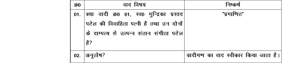 1. Feeling aggrieved and dissatisfied with judgment & decree dated 14-10-2022 passed by the Judge, Family Court, Manendragarh, District Manendragarh-Chirmiri-Bharatpur in Civil Suit No.94A/2019, the appellants herein namely, Shyama Devi – original defendant No.2 i.e. appellant No.1 herein and appellants No.2 to 5 herein who were added with the leave of the court, have preferred this appeal under Section 19 of the Family Courts Act, 1984, questioning the said judgment & decree by which the Family Court has decreed the suit filed by the original plaintiffs declaring that the original plaintiff No.1 was the legally wedded wife of Late Shri Mundrika Prasad Patel and plaintiff No.2 Sangeeta Patel is the daughter out of their wedlock.