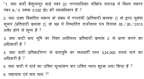 (A) The plaintiff filed a suit for declaration of title, possession, canceling the agreement dated 05.05.2003 executed between sister of plaintiff-Munni Devi namely Gangadevi and Mukesh Kumar S/o Om Prakash Agrawal and mutation order dated 06.05.2003 passed by Tahsildar in favour of Mukesh Agrawal as well as the appellate order dated 22.10.2007 passed by Sub-Divisional Officer, Raigarh, as null & void with regard to property i.e. dilapidated house constructed over Khasra No. 8/6 area 4 dismill situated at Baikunthpur, Ward No. 22 Old Raigarh (hereafter referred to as “the suit prope