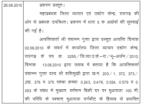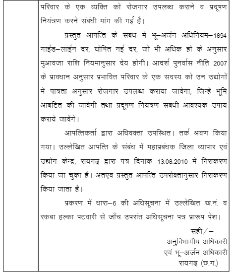 1. Two petitioners herein (petitioner No.2 died and her name has been deleted) have filed the instant writ petition calling in question legality, validity and correctness of notification dated 3-7-2010 (Annexure P-1) issued under Section 4(1) of the Land Acquisition Act, 1894 (for short, ‘the Act of 1894’) and also notification dated 6-9-2010 issued under Section 6 of the Act of 1894 and eventually seeks to quash the order dated 26-8-2010 (Annexure P-6) passed by the Sub Divisional Officer-cum-Land Acquisition Officer, Raigarh, on the ground that while making acquisition Section 5A(2) of the Act of 1894 has not been followed in its letter and spirit and the land has not been acquired for public purpose.