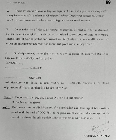 3. That during the course of investigation, the original Passport of accused was sent to FSL, Rohini for examination. As per the examination report of Departure sticker pasted on Page No. 33, it is observed that there are marks of overwritings on the short signature(initial) and figures of dates at both the places, it is again observed that existing figures of date in upper row at place of month are not the original figures. On decipherment the original figures of month could be read as ‘12’ in place of ‘11’. Similar overwritings were found at Page No. 34 on figures of date and signature while on Page No. 35, it was observed that it was not the original Visa sticker but an imitated coloured copy of Page No. 09. It can be inferred from the report of Forensic Science Laboratory th