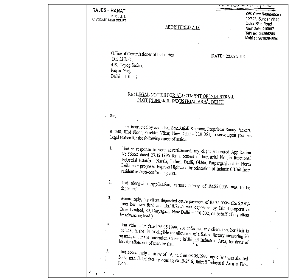 3. At the very outset, it is pertinent to note that, initially, the present petition was filed against respondent No.1/Commissioner of Industries GNCTD, and during the pendency of the present petition vide order dated 11.11.2014, it was deemed appropriate by learned Predecessor Bench that DSIIDC (Delhi State Industrial and Infrastructure Development Corporation Limited) is a necessary