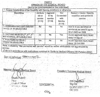 4.1. The respondent, having been found medically and physically fit, was enrolled in the Indian Air Force on 18.11.1996 and was discharged from service on 30.11.2016 in low medical category A4G4(P).Before the discharge, the Release Medical Board [‘RMB’] held on02.05.2016 assessed the respondent’s disabilities - (i) Degenerative Disc Disease L4-L5 and L5-S1 (Old) at 20% for life [‘first disability’], (ii) Fracture Neck of 2nd, 3rd, 4th Metatarsal (RT) (Old) at 20% for life [‘second disability’] and (iii) Fracture Patella (RT) (OPTD) (OLD) at 30% for life [‘third disability’] compositely