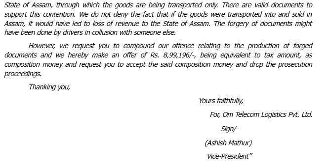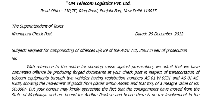 2. The challenge in the present writ petition is to an order dated 27-12-2012 passed by the Superintendent of Taxes, Khanapara Check Post, Guwahati, Assam, compounding the offence involved under Section 85 (1)(n) of the Assam Value Added Tax Act, 2003 (in short the Act of 2003), exercising the delegated power under Section 89 of the Act of 2003 and requiring the petitioner to deposit an amount of Rs. 8,99,196/- (Rupees Eight Lakhs Ninety Nine Thousand One Hundred Ninety Six) by way of composition of the said offence as alleged against the it. The challenge primarily is on the ground that under the provision of of the Act of 2003, the Superintendent of Taxes is not empowered to compound an offence under the Act.