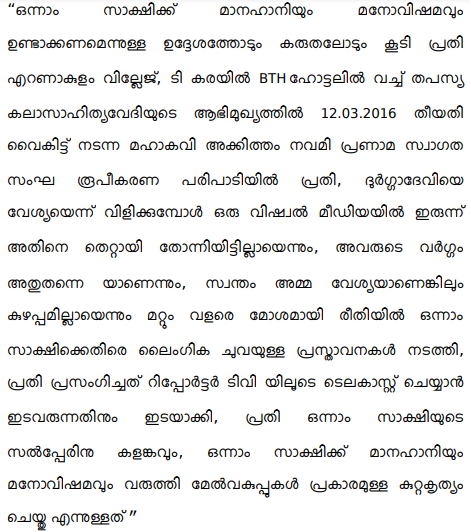 2. The petitioner is a former army officer and the second respondent is the Chief Co-ordinating Editor of Asianet News. The case was registered based on a complaint filed by the 2nd respondent alleging that the petitioner had defamed the defacto complainant and also committed the offences alleged in the final report in a speech made by him at BTH Hotel, Ernakulam. According to the petitioner, even if the entire allegations in the final report are accepted, the offences alleged are not made out and therefore prayed for quashing the final report.