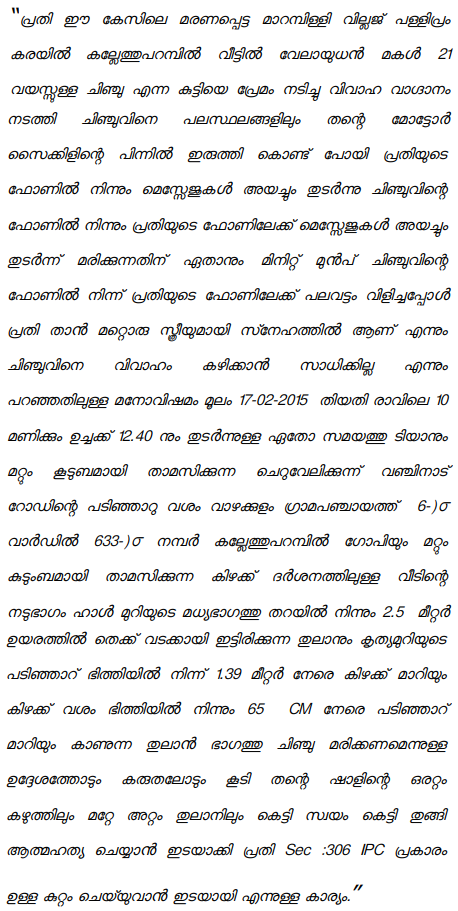 2. The prosecution case is that, on 17.02.2015 in between 8 A.M. and 12.40 P.M., the defacto complainant's adopted daughter Chinju, due to depression in her life, hang in their house and while taken to hospital at Perumbavoor, she was declared as dead. The police registered Annexure I FIR under Section 174 Cr.P.C. Thereafter the offence under Section 306 IPC is also added. The allegation against the petitioner is that the girl who committed suicide had contacted the petitioner over phone several times before committing suicide. There was a love affair between the petitioner and the deceased girl. When the petitioner withdrawn from the love affair, the girl committed suicide. Hence it is alleged that the accused committed the offence under Section 306 IPC. According to the petitioner, even if the entire allegations are accepted, no offence is made out against the petiti