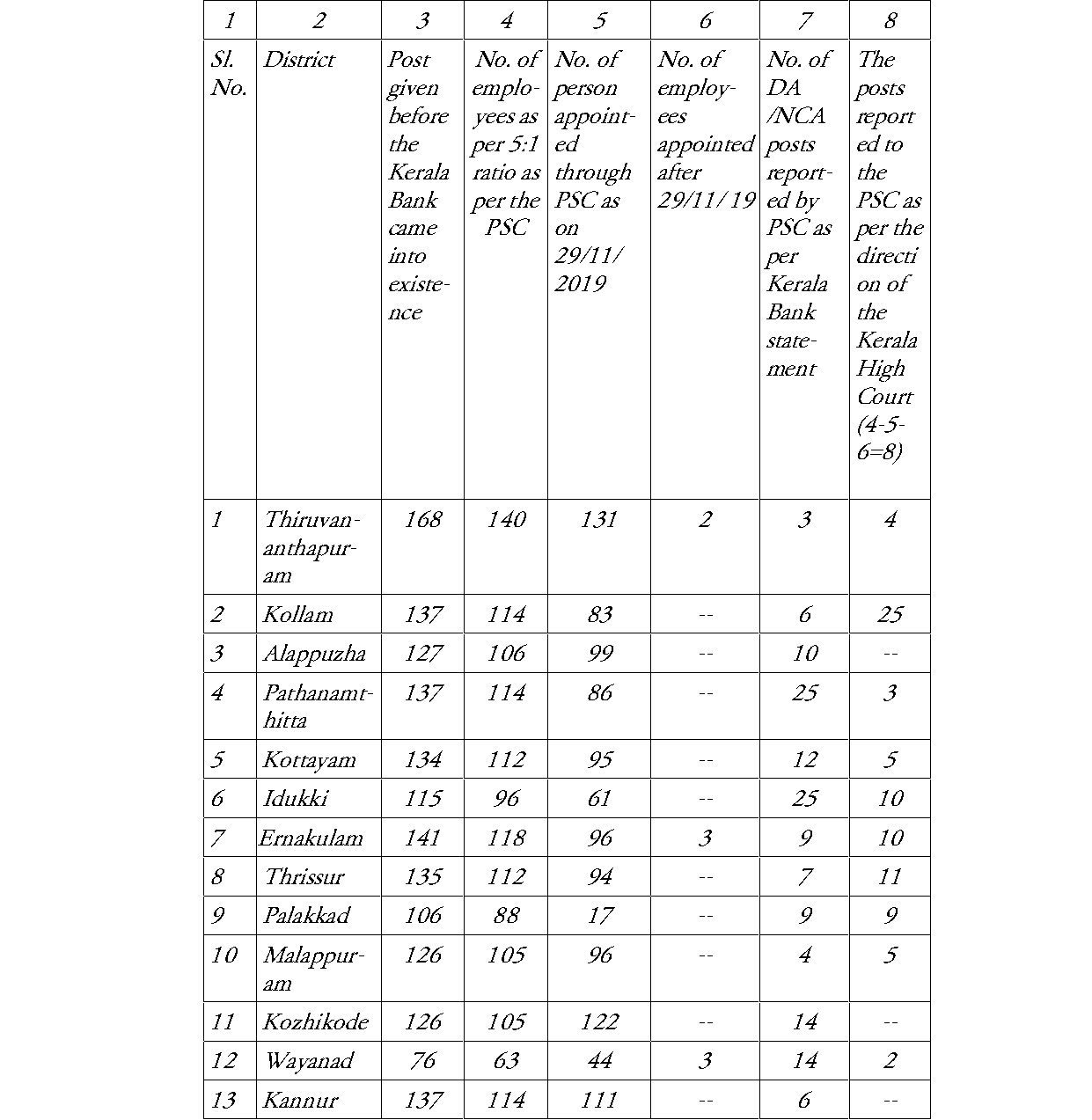 The subject matter of controversy in this group of appeals arising from the judgments of learned Single Judges of this Court relates to the post of Clerk/Cashier in the erstwhile District Co-operative Banks in Kerala. Ranked Lists were prepared by the Kerala Public Service Commission pursuant to the selection process; however, before any appointments could be made from the Ranked Lists, the District Co-operative Banks in the State were amalgamated with the Kerala State Co-operative Bank. Since the candidates included in the Ranked Lists were not appointed, they filed writ petitions seeking appropriate directions for their appointments. Several petitions were filed by individual candidates included in the Ranked Lists, and the dates and events would differ in each matter, but the legal issue being the same in all the appeals, they are dealt with by this common judgment.