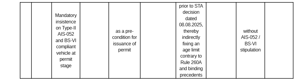 An interim order clarified that permits granted before a certain date would not be subject to these new standards, and the orders impugned in the case were quashed insofar as they mandated compliance with AIS-052 and BS-VI norms for permits granted prior to that date. The court directed the authorities to ensure uniform standards across RTAs (!) (!) .