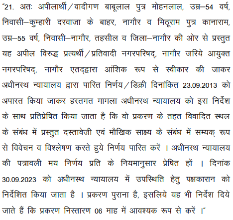 This civil misc. appeal under Order 43 Rule 1(u) read with Section 107 CPC has been preferred by the appellant-defendant against the impugned judgment dated 18.09.2023 passed by learned Additional District Judge No.1, Nagaur (for short, learned 'appellate Court') in regular appeal No.148/2013(14/2013), whereby learned appellate Court, while partly allowing the appeal, quashed and set aside the judgment and decree dated 23.09.2013 passed by learned Civil Judge (Jr. Division), Nagaur, (for short, 'learned trial Court'), in civil original suit No.68/2008, remanded the matter back to learned trial Court for deciding the suit afresh after considering the oral and documentary evidence.