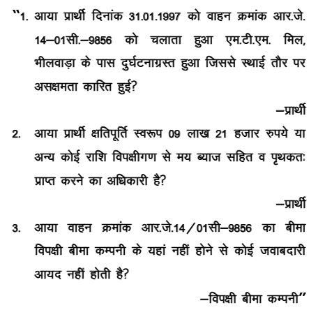 2. Brief facts of the case in nut shell are that the appellant- claimant was driving a Maruti Car bearing registration No.RJ14- 01C-9856. At about 12:30 am, when he reached near M.T.M. Mill, an unidentified truck collided with the car, as a result of which the appellant–claimant sustained various injuries of simple as well as grievous in nature. Thus, a claim petition was filed by the appellant-claimant. After service of notice, respondent No.2- Insurance company filed its reply and denied the averments made in the petition. On the basis of the pleadings of the parties, the Tribunal framed following three issues on 12.10.2009:-