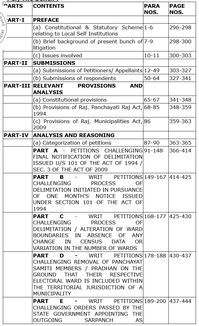 The judgment addresses a large number of writ petitions and special appeals challenging the delimitation of Panchayati Raj Institutions and Municipalities in Rajasthan, including inclusions/exclusions of areas, ward boundaries, and related electoral processes under the Rajasthan Panchayati Raj Act, 1994, and the Rajasthan Municipalities Act, 2009 (!) .