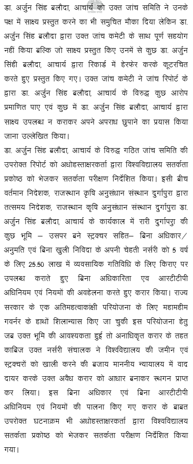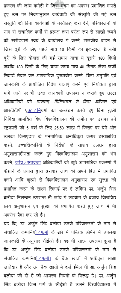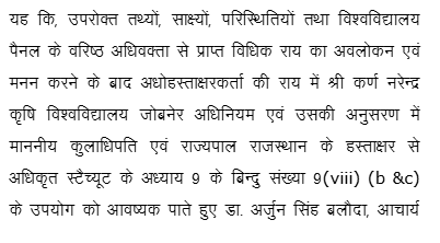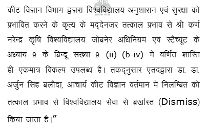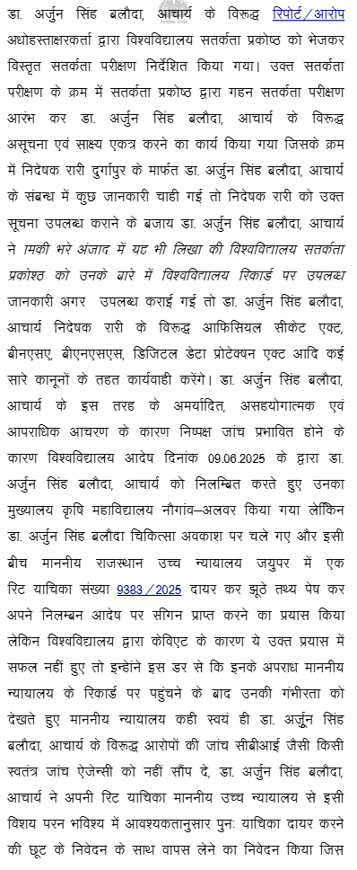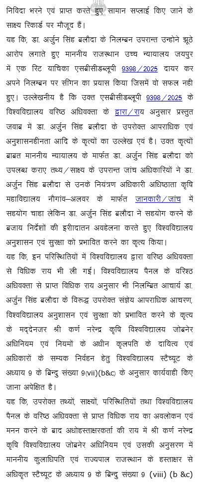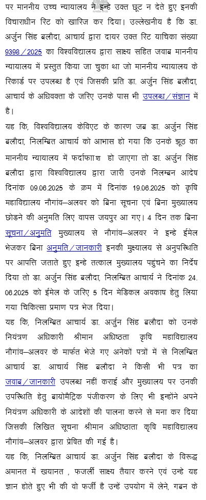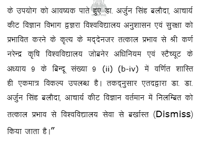 1. Instant writ petition is preferred by petitioner Dr. Arjun Singh aggrieved from order dated 14.07.2025 whereby the petitioner was dismissed from service by the Vice-Chancellor of Sri Karan Narendra Agricultural University, Jobner, Jaipur (hereinafter referred as “Univesity”), and for ready reference, dismissal order dated 14.07.2025 is reproduced as under: