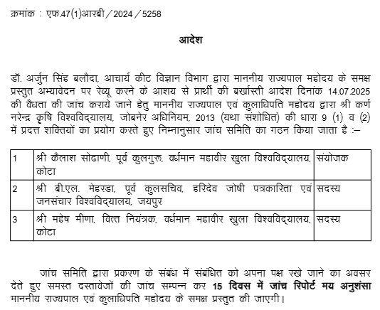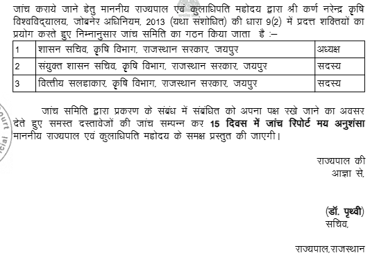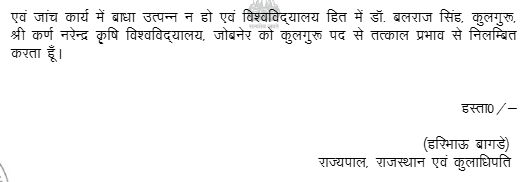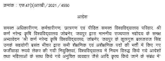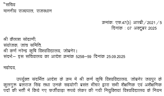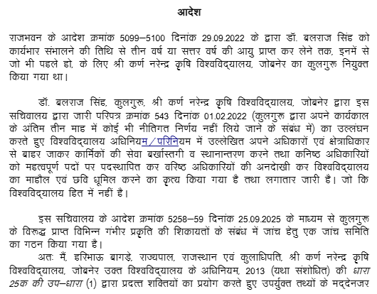 1. Instant Writ Petition is preferred by petitioner who was appointed as Vice-Chancellor, Sri Karan Narendra Agriculture University (hereinafter referred as the “University”) under the Sri Karan Narendra Agriculture University, Jobner Act , 2013 (hereinafter referred as “Act of 2013”) by order dated 29.09.2022 by the Chancellor (The Governor of State of Rajasthan) for a period of 3 years. Admittedly, the term of 3 years is going to an end on 14.10.2025 as the petitioner has joined on the post of Vice-Chancellor of State University on 15.10.2022.