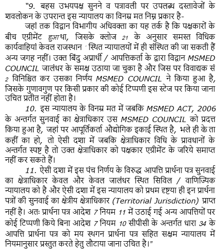The arbitration agreement's designation of venue and exclusive jurisdiction prevails over statutory arbitration under the MSMED Act, and the statutory arbitration does not override the parties' agree....