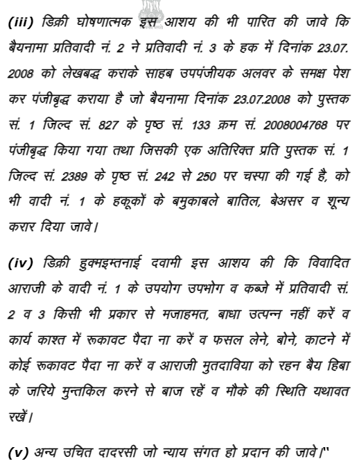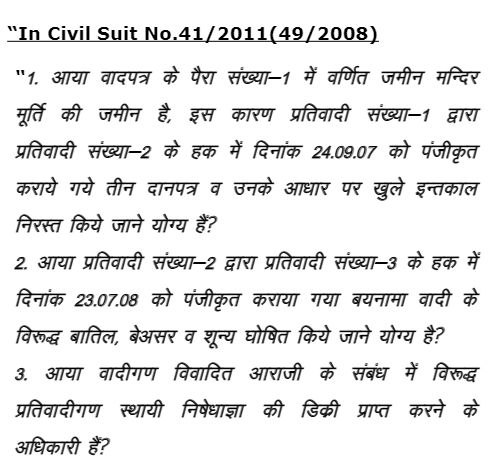 The facts emerge out from the pleadings are that on 17.11.2008 the plaintiff - respondents No. 1 to 4 filed a suit against the defendants appellants and defendant - respondent No. 1 and 3 for declaration and permanent injunction stating therein apart from other facts that the plaintiff respondent Mandir Murti Shri Charan Das Ji Maharaj is situated in Kasba Dahra, earlier which was known as Mandir Bihari Ji, but due to tapsaya by Sant Charan Das Ji Maharaj between 1859 to 1871 in the temple it is being called as Mandir Murti Shri Charan Das Ji Maharaj, Dahra. Erstwhile Alwar His H