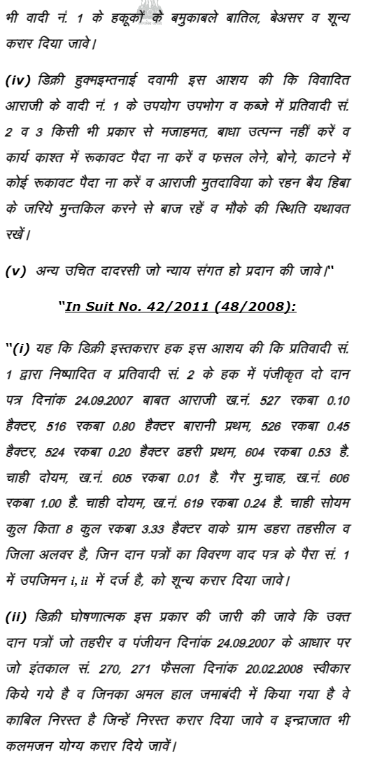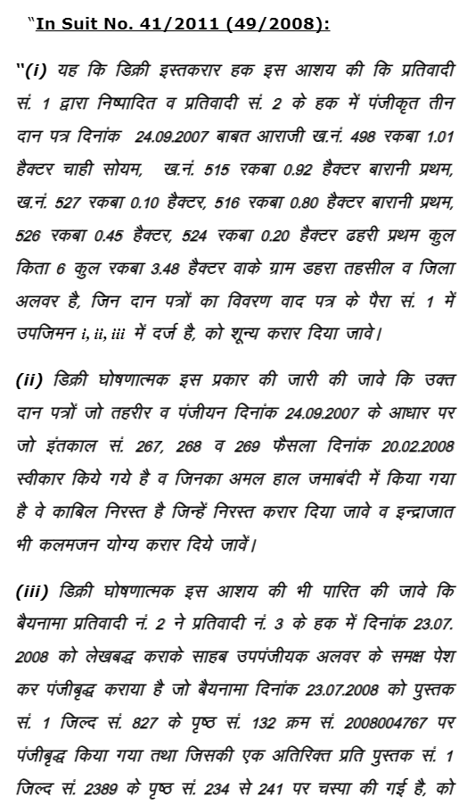 2. These four appeals have been filed by the appellants for quashing and setting aside the judgment and decree dated 12.01.2018 passed by the Court of learned Addl. District Judge No.3, Alwar (for short ‘the court below’) in Civil Suit No. 41/2011 (49/2008) and in Civil Suit No.42/2011 (48/2008)-in First Appeal No.359/2018.