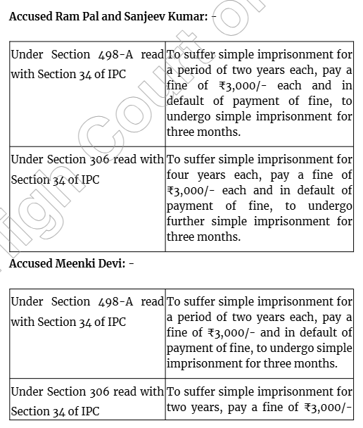 1. The present appeals are directed against the judgment of conviction and order of sentence dated 30.11.2012, passed by learned Sessions Judge, Kangra at Dharmshala (learned Trial Court), vide which the appellants (accused before learned Trial Court) were convicted of the commission of offences punishable under Section 498A and 306 read with Section 34 of Indian Penal Code (IPC) and were sentenced as under:-