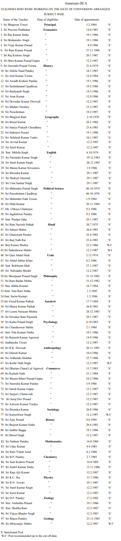 (i) That S.J.S.N College, Garhwa became a constituent college of Ranchi University on 31.03.1987. The writ petitioner was appointed as Lecturer on 22.02.1986 on the unsanctioned 5th post in the Department of Hindi in SJSN College, Garhwa.