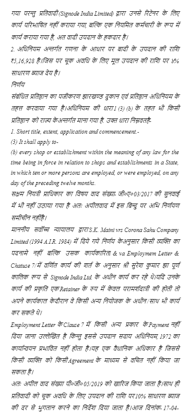 1. The present Appeal has been filed under Clause-10 of the Letters Patent against the order dated 19.02.2024 passed by the learned Single Judge in W.P.(S) No. 3244 of 2023, whereby and whereunder, the learned Single Judge while dismissing the writ petition filed by the petitioner (appellant herein) had not interfered with the order dated 18.4.2019 passed by the respondent no.2 in Case No. GA-3/2017 and order contained in Memo No. 732/Ranchi, dated 19.4.2023 passed by Labour Commissioner, Jharkhand-cum-Appellate Authority under payment of Gratuity Act, 1972 [in short, Act] in Appeal Case No. P.G.-5 of 2019 and has held that the respondent no.3 is entitled for claim of gratuity under the Payment of Gratuity Act, 1972.