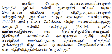 Candidates must have studied in Tamil medium throughout their education to qualify for PSTM reservation, regardless of the medium of instruction for their diploma.