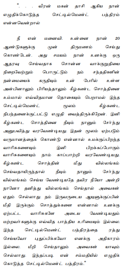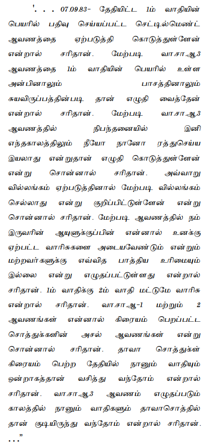 3. The 1st and 2nd plaintiffs are the wife and the daughter of 1st defendant respectively. The 2nd defendant is the daughter of one Karuppayee, with whom the 1st defendant was in a relationship with, however 2nd defendant was not born to 1st defendant. The Suit Property is separate property of the 1st defendant. On September 7, 1983, the 1s