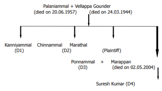 3. One Vellapa Gounder married one Palaniammal. From the wedlock, three daughters and one son were born. The daughters are Kanniyammal, Chinnammal, Marathal and the son is one Marappan. The plaintiff/Marathal is the youngest of three sisters. For easy understanding, the genealogy chart is extracted hereunder :