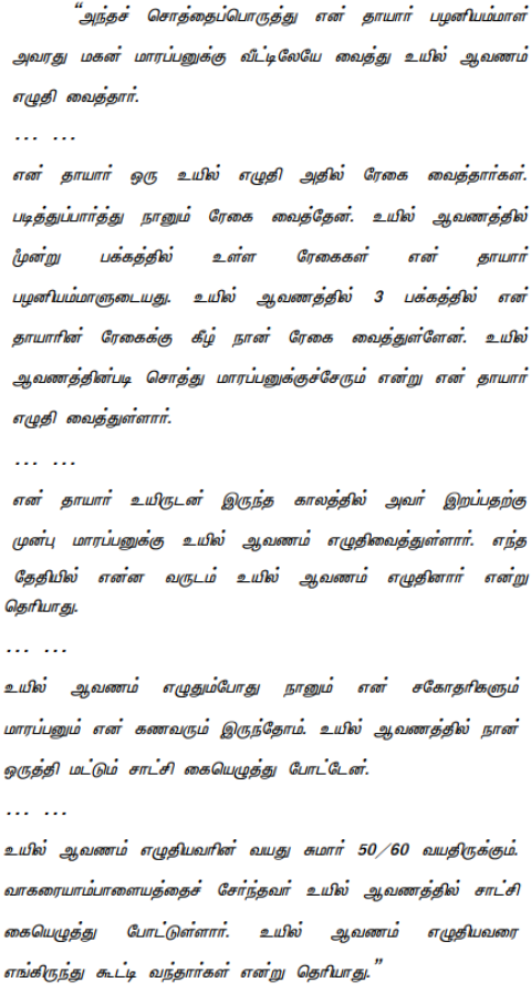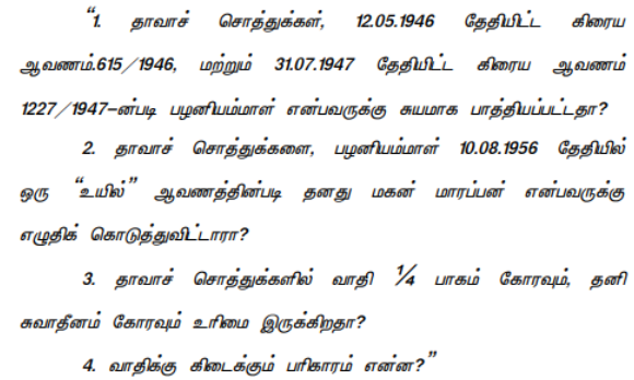 4. Palaniammal purchased Item I of the suit schedule mentioned property on 12.05.1946. Item II of the suit schedule mentioned property was purchased by her on 31.07.1947. Both the purchases were made after the death of her husband/Vellappa Gounder on 24.03.1944. There is no dispute that she was the absolute owner of the property.