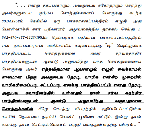 The court established the principle that under the Tamil Nadu Amendment Act 1/1990, a daughter is entitled to her share in ancestral property, and any disposition or alienation without her consent is....