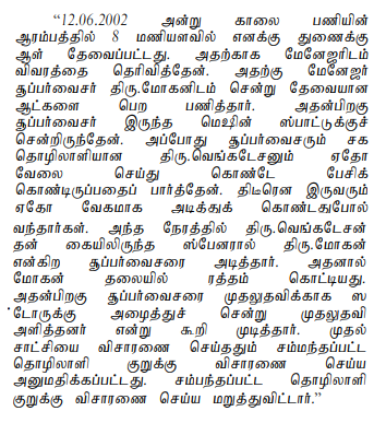 We are engaged in the manufacture of welding electrodes at the below mentioned address since 1990. In our factory on June 12, 2002 at about 8.45 A.M two employees Mr.M.Venkatesan and Mr.M.Mohan had quarelled and hit each other which resulted in injury for both. Both the injured were sent to hospital for first aid but Mr.Venkatesan refused to go for first aid. After first aid when Mr.Mohan was coming back from hospital he was hit heavily by a group of about six persons near Sedarapet bus stop leaving him injured. After these incidents a group of about 20 people entered our factory premises on the same day evening and threatened us and our employees using harsh words. Further