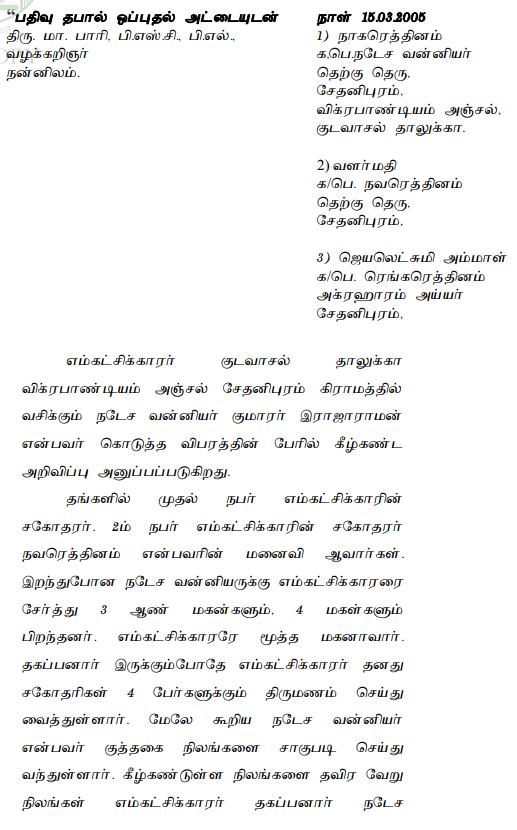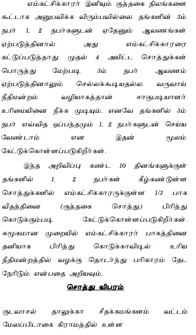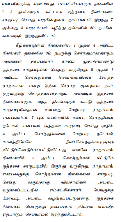 4. The plaintiff filed the Original Suit for partition claiming that Item No.1 of Suit Properties belonged to plaintiff’s father - Nadesa Vanniyar while Item No.2 is Nadesa Vanniyar’s lease hold properties owned by third defendant - Jayalakshmi. Nadesa Vanniyar’s wife predeceased him. Nadesa Vanniyar died intestate around 1992, leaving behind his three sons - the plaintiff, the first